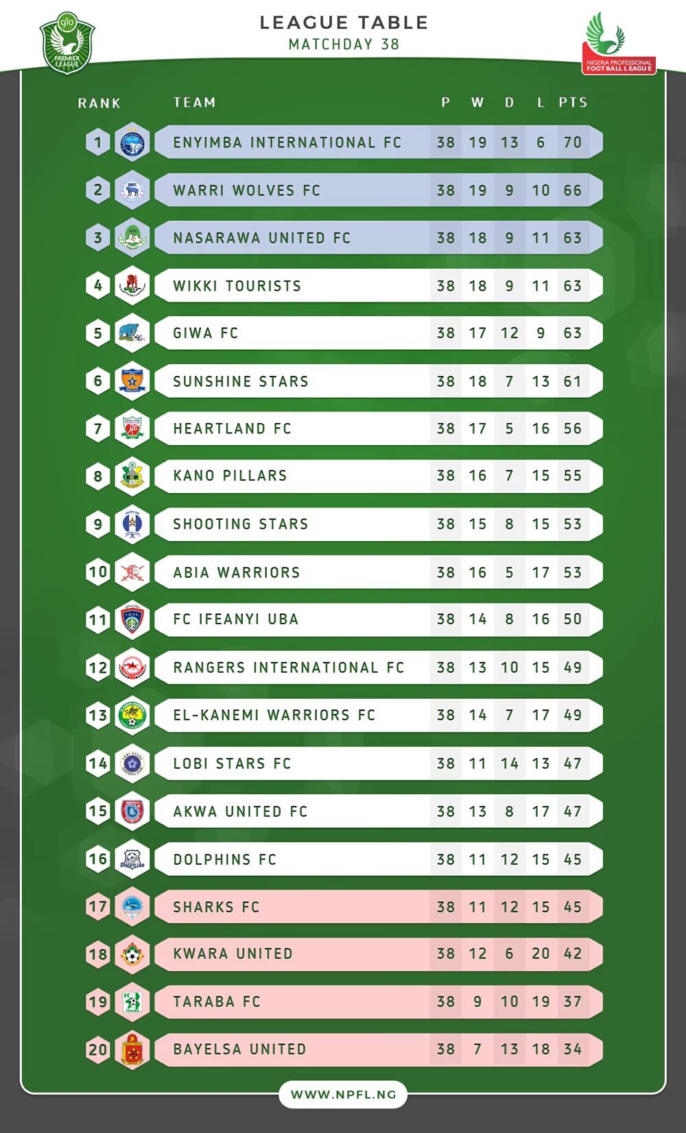 Warri Wolves defeated already relegated Taraba FC 5-1 with Gbolahan Salami emerging as the highest goal scorer with 17 goals. Warri Wolves and Nasarawa United will join Enyimba in the continent. Lobi Stars or Akwa United will join them after the Federation Cup final on Sunday.