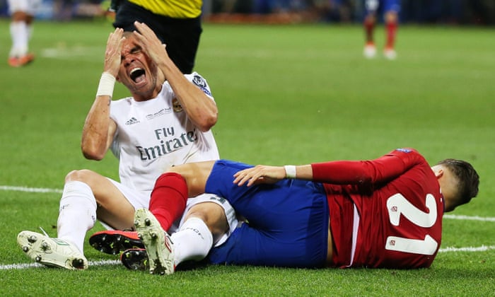 Sad night for Diego Simeone. Sad night for Torres. Tormenting night for Greizmann. His missed penalty will haunt him. Hopefully he gets over it before the Euros. Escrutiating night for Jaunfran – his kick struck the bar to give Ronaldo the opportunity to show us his nipples. Poor penalty night for Oblak. Twice they have faced Real Madrid in the UCL final, twice they have lost. Till next season. But can we allow Pepe’s antics to continue? Sean Ingle blog on the Guardian throws more light.