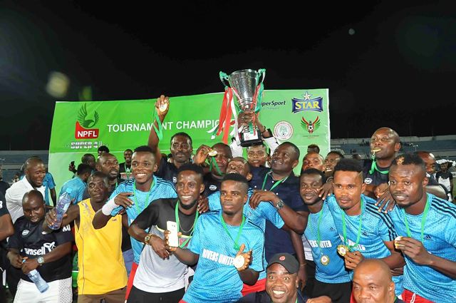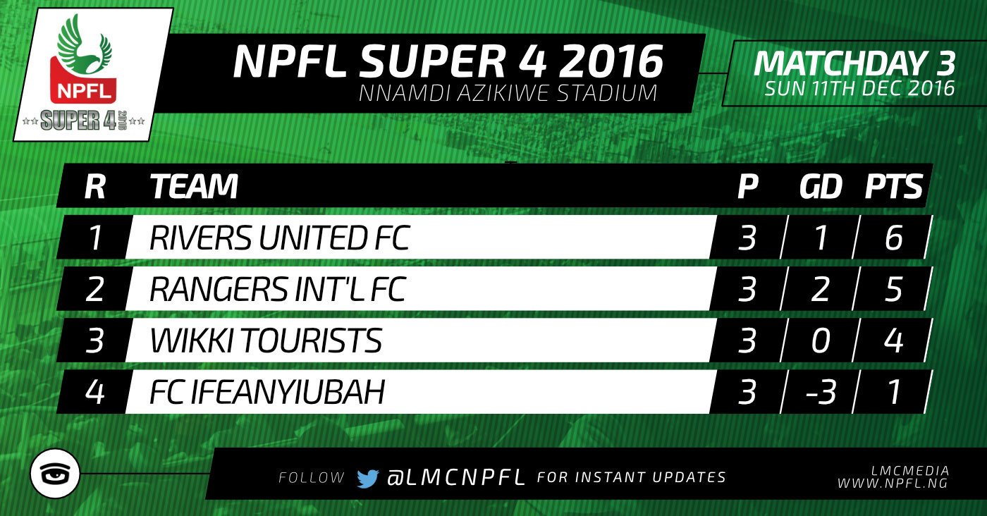 Rivers United emerged champions of the 2016/17 NPFL Super 4 in Enugu on Sunday. They amassed a total of 6 points from 3 games to add a silverware to their cabinet. Guy Kuemian’s 5th goal from a defensive error gave Rivers United a last day 1-0 victory over Wikki Tourists.